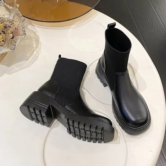 Bottines tricotées à talons carrés et semelle épaisse pour femmes